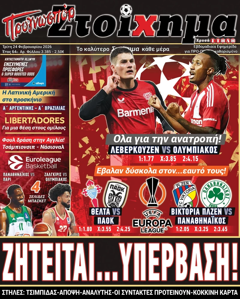 | NBA | 02:00 | 5045 | 1.84 | Ντιτρόιτ Πίστονς | Σαν Αντόνιο Σπερς | 1.94 | ||||||