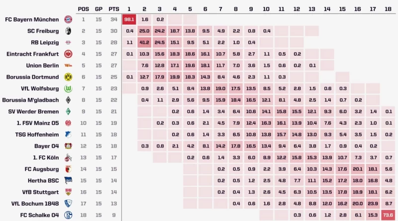 Αυτή τη στιγμή, έχει ποσοστό να βγει 3η στη βαθμολογία 57.9%, πολύ υψηλό νούμερο. Για τη 4η θέση έχει 19%. Πριν τη νίκη της επί της Στουτγκάρδης αυτά τα ποσοστά είχαν μεγαλύτερη απόκλιση. Για την 3η θέση είχε 40.7% και για την 4η 30.1%. Πλέον έχει γερές βάσεις για να κάνει μια εξαιρετική χρονιά.